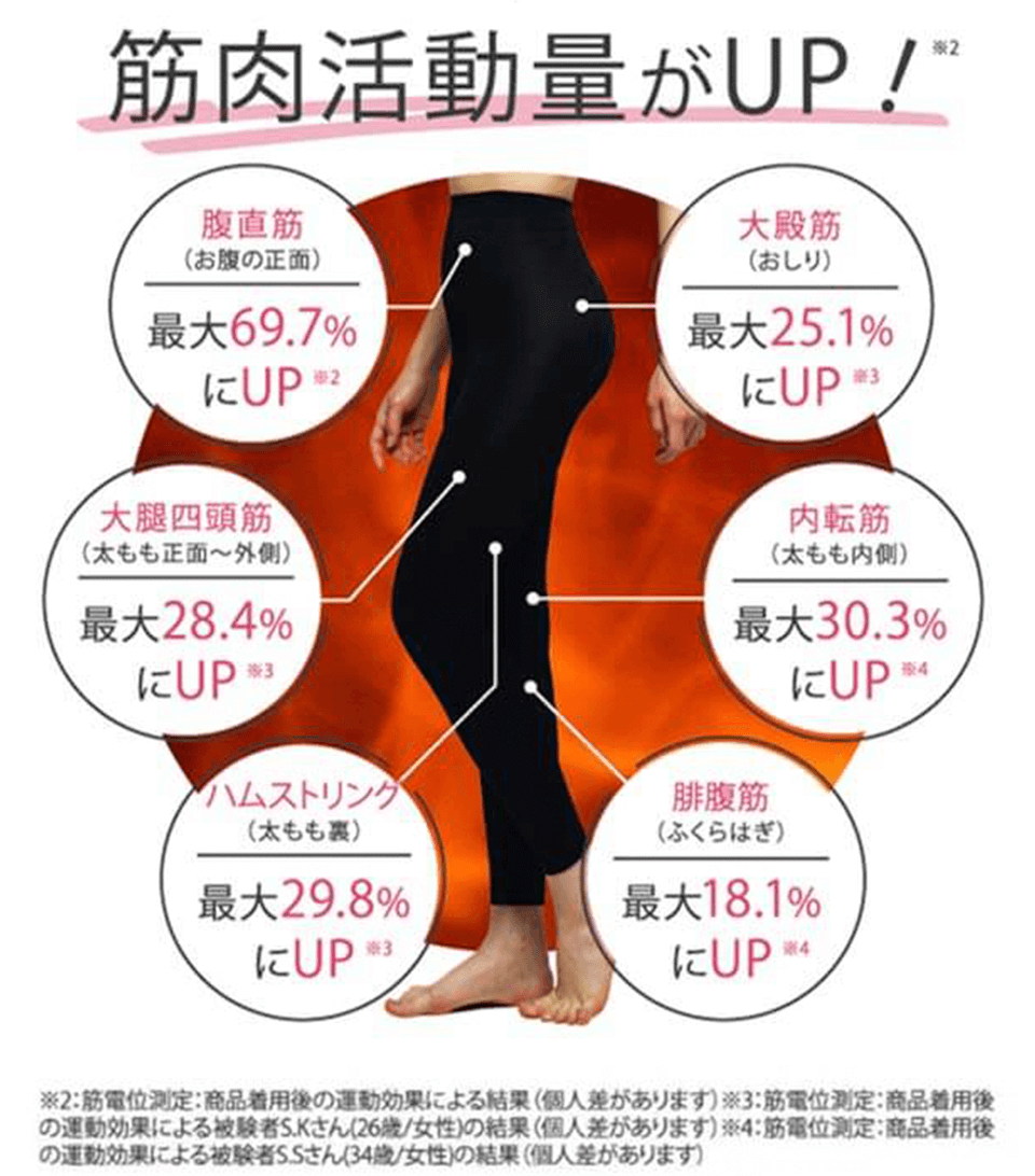 *1 着用時の物理的効果による *2 人体生理計測:呼吸代謝測定/商品着用後の運動効果による結果(個人差があります)