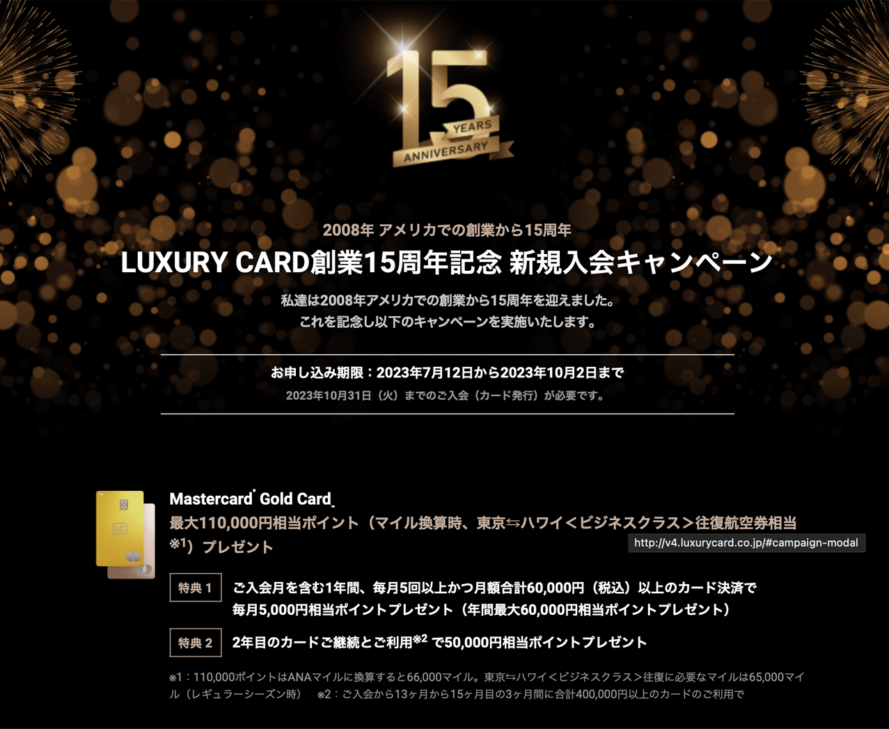 新規入会で最大110,000円相当のポイントが貰えるキャンペーン※1を開催中とのこと!(マイル換算で東京⇔ハワイ<ビジネスクラス>往復航空券に交換できるほどのポイント数が貰えます!)